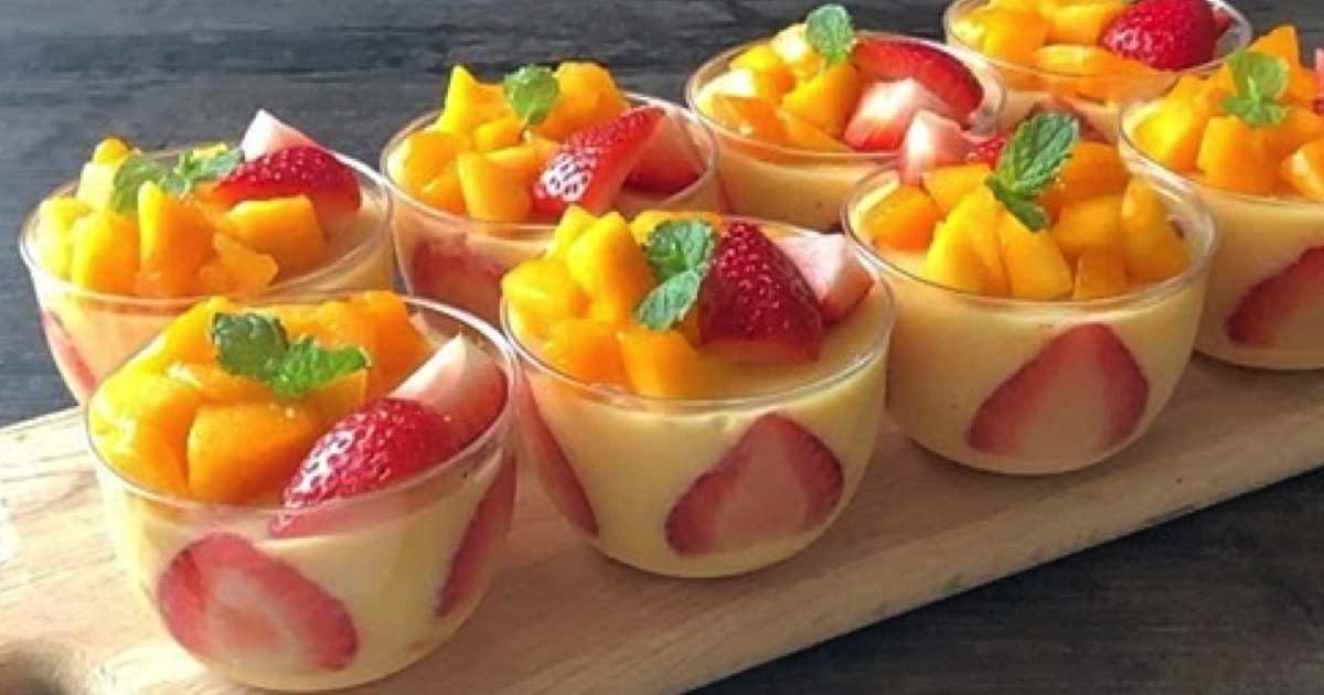 Przygotuj pucharki deserowe. Ułóż na dnie biszkopty, kolejno masę z mlekiem skondensowanym i kawałki owoców, aż pucharki będą prawie pełne.