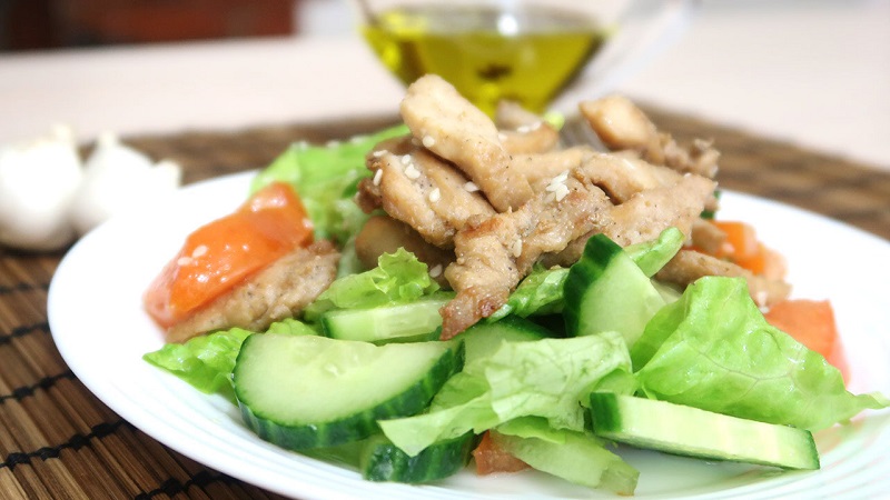 Przygotowanie: Mięso pokrój na drobne kawałki, a następnie włóż je do marynaty z sosu sojowego i czosnku. Marynuj przez 20 minut i po tym czasie usmaż na oleju.Sałatę dokładnie umyj i porwij.Pomidora i ogórka posiekaj.Umieść wszystko w jednej misce, dokładnie wymieszaj i przypraw solą, pieprzem oraz oliwą.