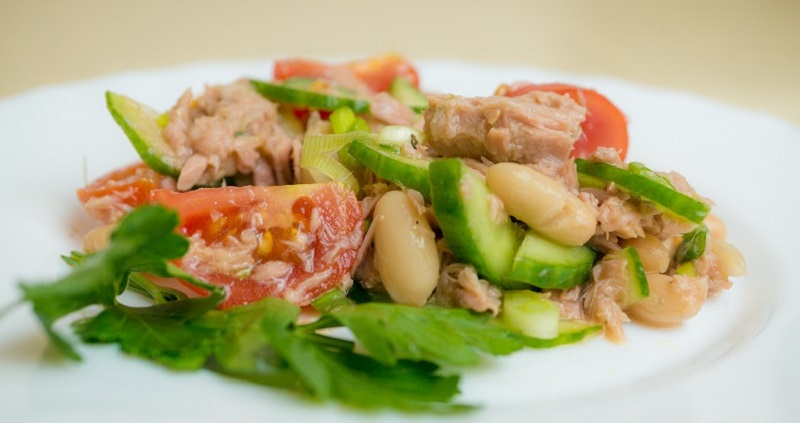 Przygotowanie: Dokładnie umyj warzywa, a następnie posiekaj pomidory i ogórki.Odcedź fasolę. Tuńczyka rozdrobnij widelcem.Pomidory, ogórki, fasolę oraz tuńczyka włóż do miski. Całość ozdób krążkami z cebuli.Przypraw solą, pieprzem, oliwą z oliwek oraz sokiem z cytryny.