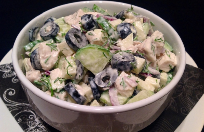 Przygotowanie: Jabłka zetrzyj na tarce lub pokrój na drobne kawałki. Mięso ugotuj, a następnie pokrój.Ogórki posiekaj w kostkę, a oliwki przekrój na pół.Połącz ze sobą wszystkie składniki w misce, dodaj jogurt i przypraw solą oraz pieprzem.