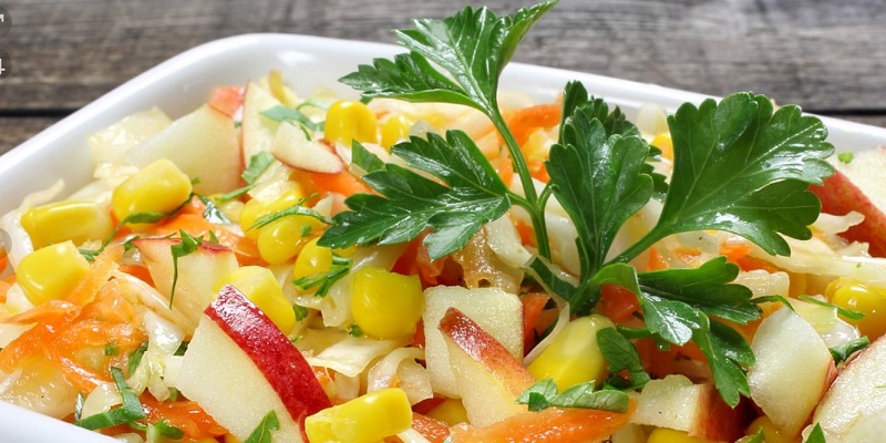 Przygotowanie: Jabłko obierz, a następnie zetrzyj na tarce lub pokrój. Marchewkę i kapustę pokrój. Pokrojone jabłko, marchewkę oraz kapustę wymieszaj z kukurydzą. Przypraw solą, pieprzem oraz dodaj sok z cytryny.