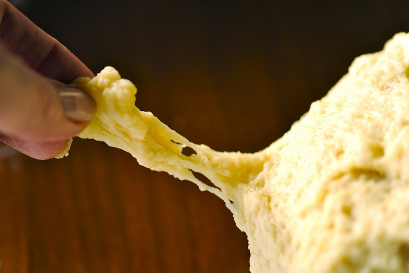 Na środku mąki zrobić dołek. Dodaj masło i skórkę z cytryny. Na koniec, wmieszaj jajka, żółtka i mieszankę drożdżową. Ciasto należy wyrabiać energicznie, nie powinno to trwać dłużej niż 10 minut. Ciasto powinno być elastyczne i przypominać gumę do żucia.