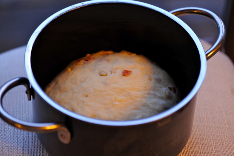 Na końcu dodajemy orzechy, sułtanki i owoce kandyzowane. Wymieszaj orzechy z ciastem. Pozostawić ciasto do wyrośnięcia w ciepłym, przykrytym miejscu. Gdy ciasto podwoi swoją objętość, przełóż je do formy wyłożonej papierem do pieczenia. Wypełnić formę w 1/3 ciastem.