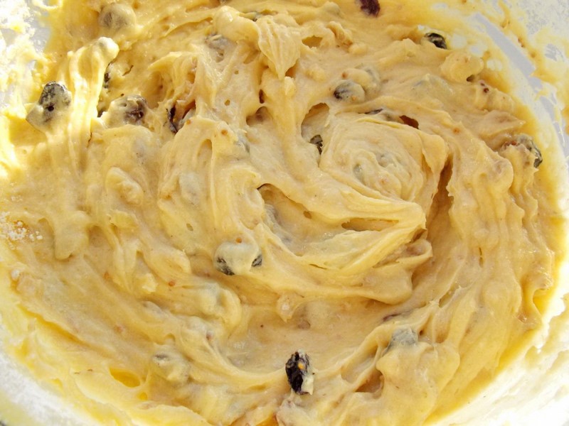 Później trzeba dodać do składników mąkę, proszek do pieczenia oraz rodzynki. Po wysmarowaniu formy masłem, należy przelać do niej ciasto.