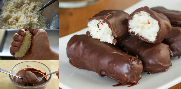 Do miski średniej wielkości wsyp wszystkie wiórki, a następnie dodaj do nich szklankę mleka skondensowanego Całość dokładnie wymieszaj, a następnie uformuj masę w podłużne kawałki, które będą przypominać batoniki. Ukształtowane batoniki wstaw do zamrażarki na 20 minut. Do kąpieli wodnej wstaw czekoladę i rozpuść ją. Wyjmij batoniki z zamrażarki, a następnie po kolei zamaczaj je w rozpuszczonej czekoladzie.