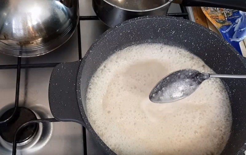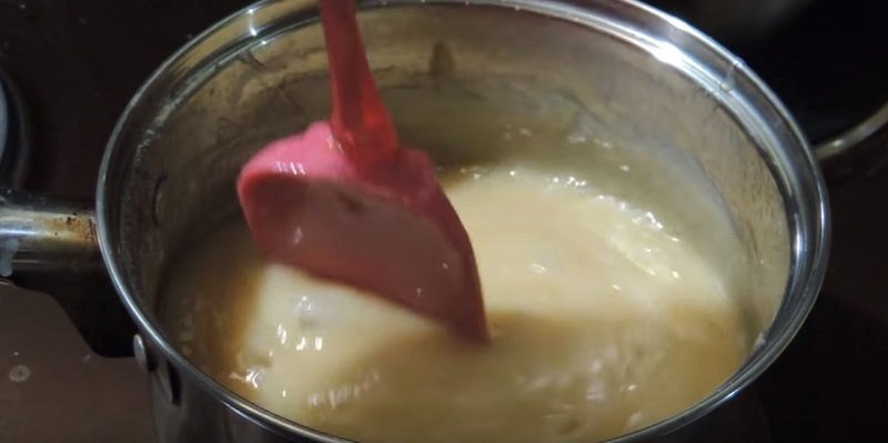Pozostawić tak bez mieszania. Jednakże należy pilnować, kiedy cukier rozpuści się. Wtedy trzeba zwiększyć ogień, a potem dodać masło do naczynia. Odtąd należy dokładnie mieszać. W drugim pojemniku podgrzać mleko, a następnie przelać je do gorącego cukru z rozpuszczonym masłem.