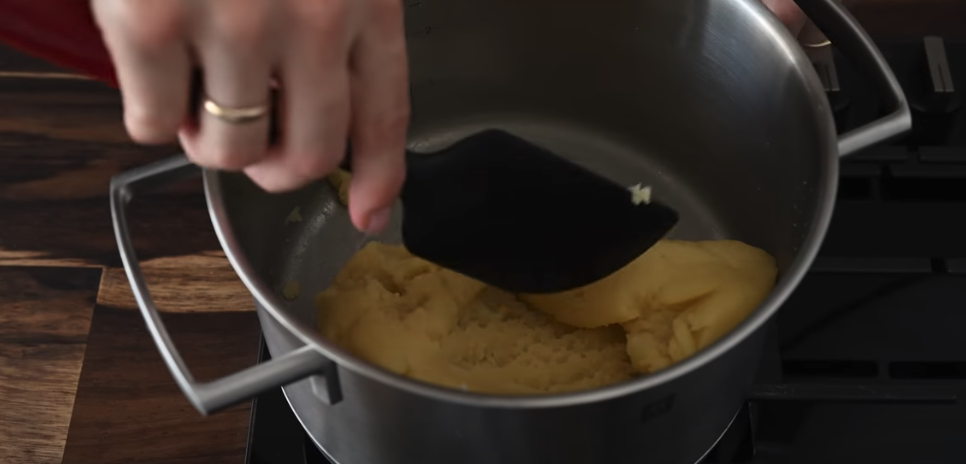 W garnku wymieszaj 130 ml mleka, 130 ml wody, 1 łyżeczkę soli, 100 g masła i 20 g cukru. Doprowadź mieszankę do wrzenia. Gdy mieszanka zacznie się gotować, dodaj 160 g mąki i energicznie mieszaj, aż ciasto będzie gładkie i zacznie odchodzić od ścianek garnka. Kontynuuj mieszanie ciasta na ogniu przez około 2 minuty, aby mąka dobrze się połączyła.