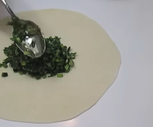 Nadzienie: Na patelni podsmażamy cebulę, dodajemy szpinak i przyprawy.