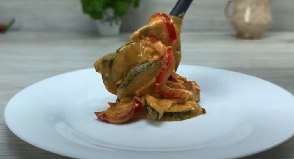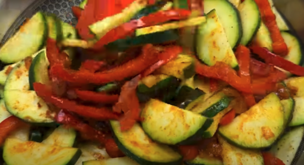 Drobno posiekaj cukinię. Pokrój cebulę i słodkie papryczki w drobną kostkę. Posiekaj pomidory i pietruszkę. Wyciśnij sok z cytryny. Na patelni rozgrzej 2 łyżki oleju do smażenia. Dodaj posiekaną cebulę i smaż przez 2-3 minuty, aż będzie miękka. Dodaj łyżkę papryki i słodkie papryczki. Dopraw solą i pieprzem.