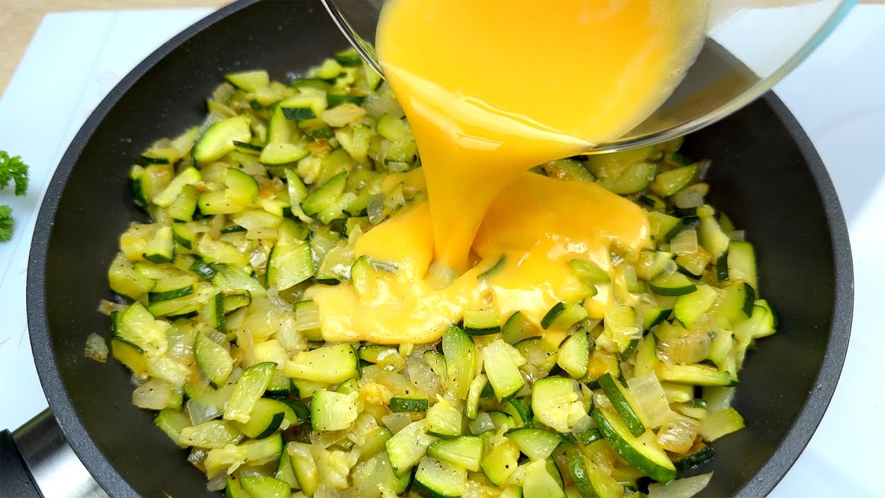 Dodaj posiekaną cukinię i smaż na małym ogniu przez 15-20 minut, od czasu do czasu mieszając. W misce rozbij 2 jajka, dopraw solą i pieprzem, a następnie wlej na patelnię z cukinią. Dodaj posiekany czosnek. Przykryj i gotuj przez 3 minuty.