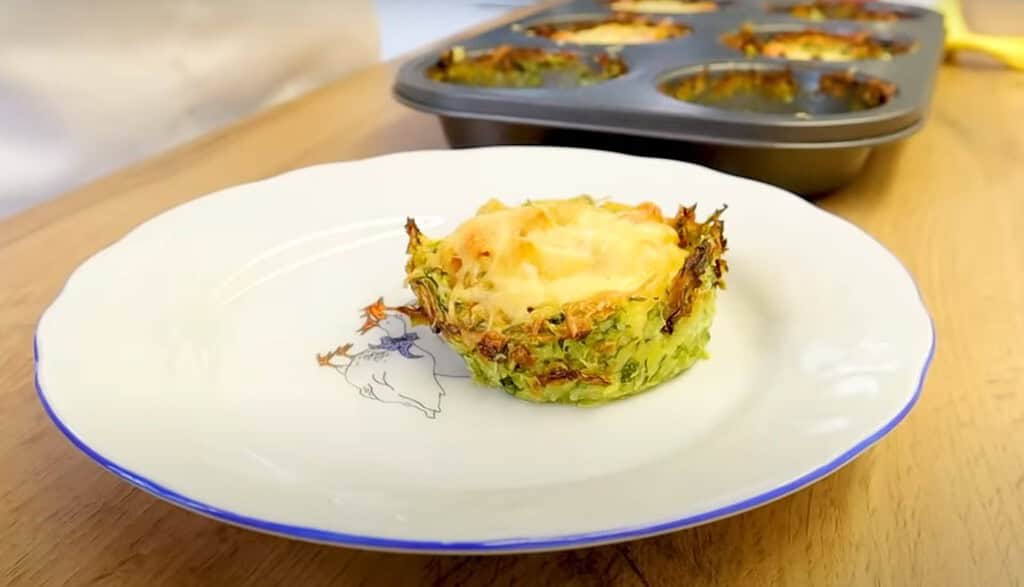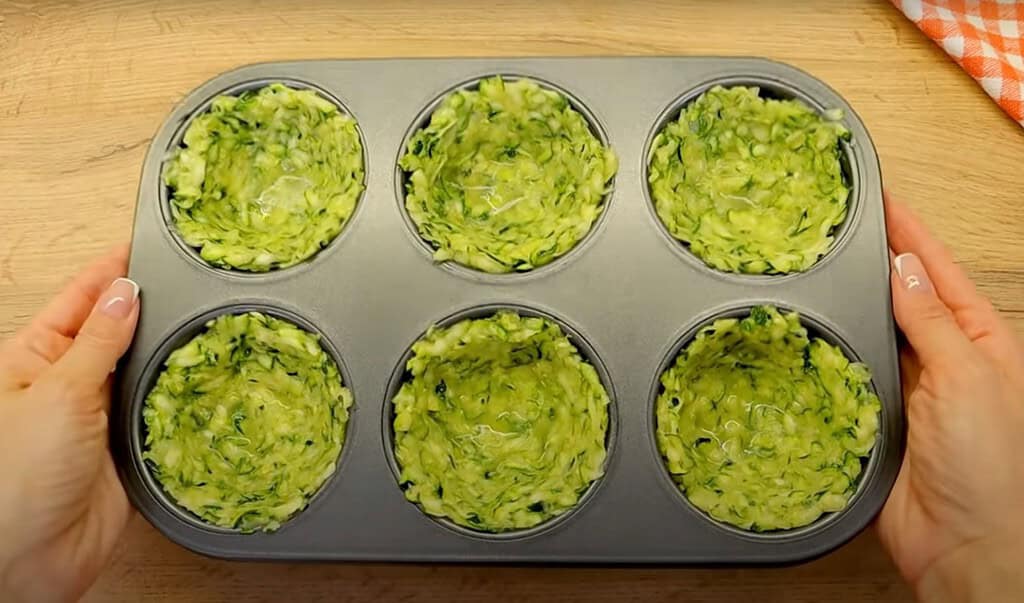 Mieszamy z jajkiem, solą i pieprzem. Formę do muffinów wysmaruj olejem, ułóż warstwę mieszanki cukinii. Dociśnij łyżką tak, aby uformowały się kubki cukinii.