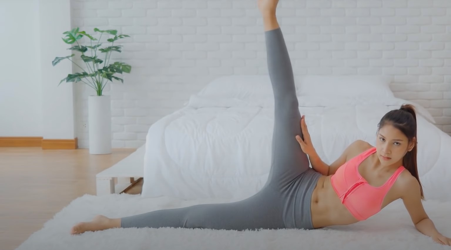 Połóż się na plecach z łokciem opartym o łokieć. Wyciągnij łokieć i unieś jedną nogę najwyżej, jak potrafisz. Przez 30 sekund powtarzaj tę samą czynność po obu stronach.