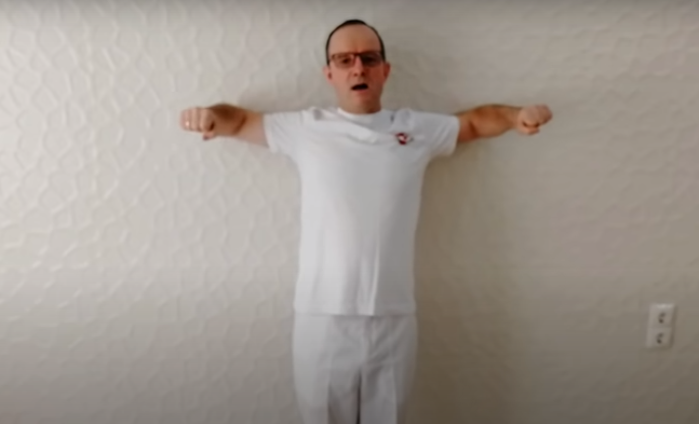 Rozpocznij od stania plecami do ściany, a następnie zrób krok w jej kierunku. Następnie opieramy barki i łopatki o ścianę. Ramiona powinny być ustawione pod kątem. Przyciśnij łokcie do ściany, aby rozluźnić ramiona.