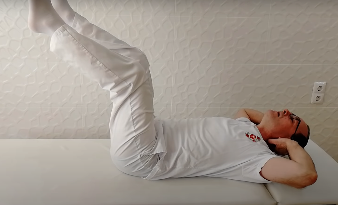Jest to świetny sposób na zmniejszenie bólu w okolicy kości krzyżowej. Ćwiczenie to polega na leżeniu na plecach na kanapie lub na ziemi i podnoszeniu nóg do kolan. Jeśli jest to niemożliwe z powodu silnego bólu, można również podeprzeć głowę na stołku lub niskim taborecie. Wykonaj wdech i umieść ręce za głową. Szyja powinna pozostać wyprostowana.