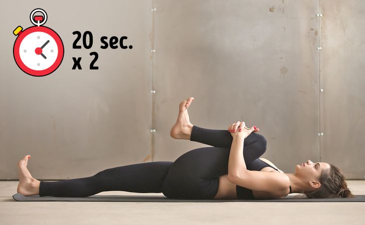W tym ćwiczeniu należy położyć się na plecach, zgiąć obie nogi i opleść ramiona wokół kolan, przyciągając je do klatki piersiowej. Rozciąganie mięśni jest tym mocniej odczuwalne, im silniej są przyciągane kolana. Dzięki wykonywaniu tego ćwiczenia można poprawić krążenie krwi, a także zwiększać zakres ruchu mięśni, które znajdują się w dolnej części pleców. Ćwiczenie wykonuje się przez 20 sekund i powtarza dwukrotnie.