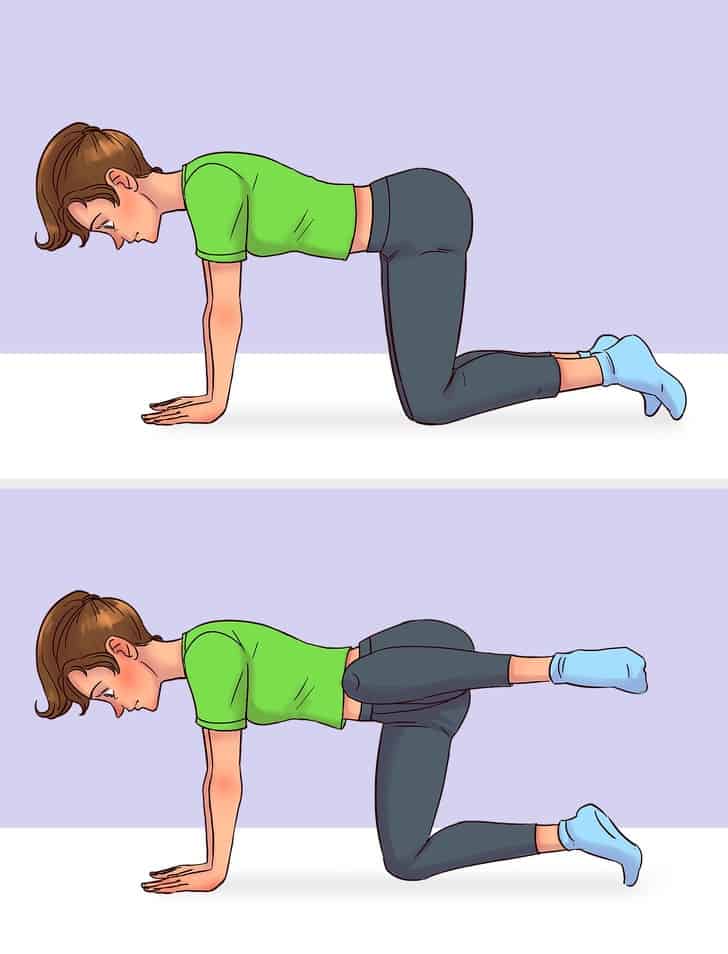Przejdźmy do wykonania. Przyjmij pozycję klęczącą. Kolana umieść bezpośrednio pod biodrami, oprzyj dłonie tak, aby znalazły się pod ramionami. Lewą nogę podnieś w górę i odsuń od ciała tak daleko jak to możliwe. Wróć do pozycji pierwotnej i zrób to samo z prawą nogą. Na to ćwiczenie także poświęć około minuty.