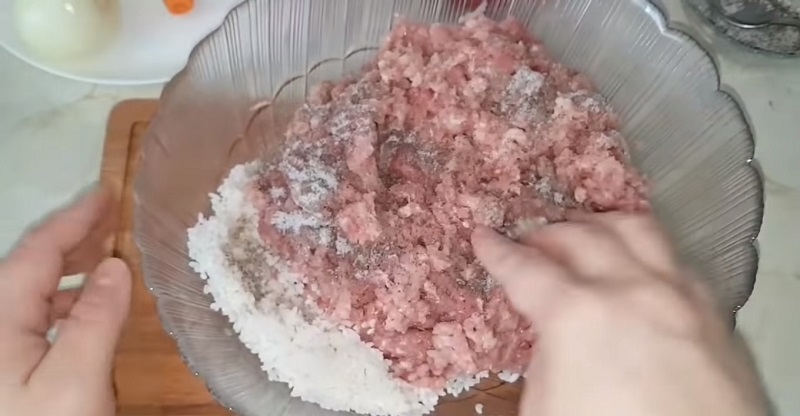 W czasie, kiedy liście kapusty stygną przygotuj farsz do gołąbków. Ryż przelej gorącą wodą i dokładnie go opłukaj. Możesz wcześniej ugotować ryż na półtwardo. Do ryżu dodaj mielone mięso wieprzowe i dokładnie wymieszaj. Dopraw całość solą i pieprzem do smaku.