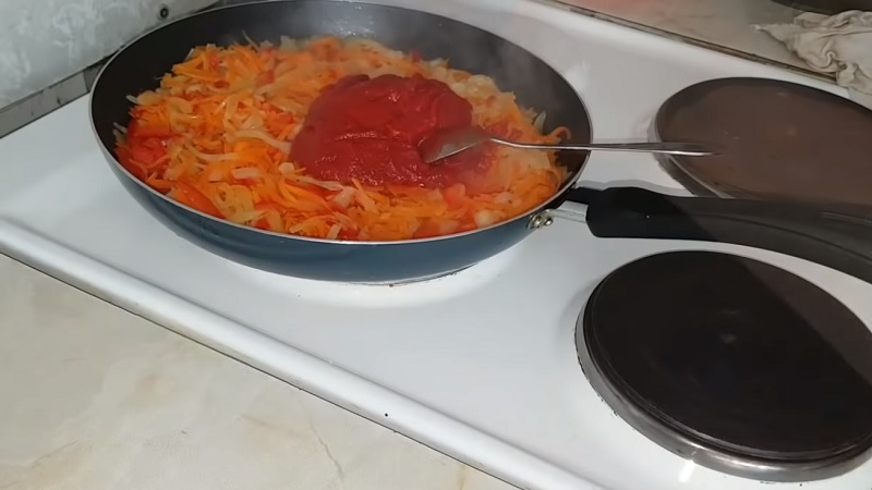 W dalszej kolejności drobno posiekaj cebulę oraz marchewkę i usmaż je na oleju roślinnym. Smaż przez około 5-7 minut i po tym czasie dorzuć drobno pokrojoną paprykę. Do warzyw dodaj przecier pomidorowy i starannie wymieszaj. Smaż całość przez 2 minuty, ciągle mieszając.