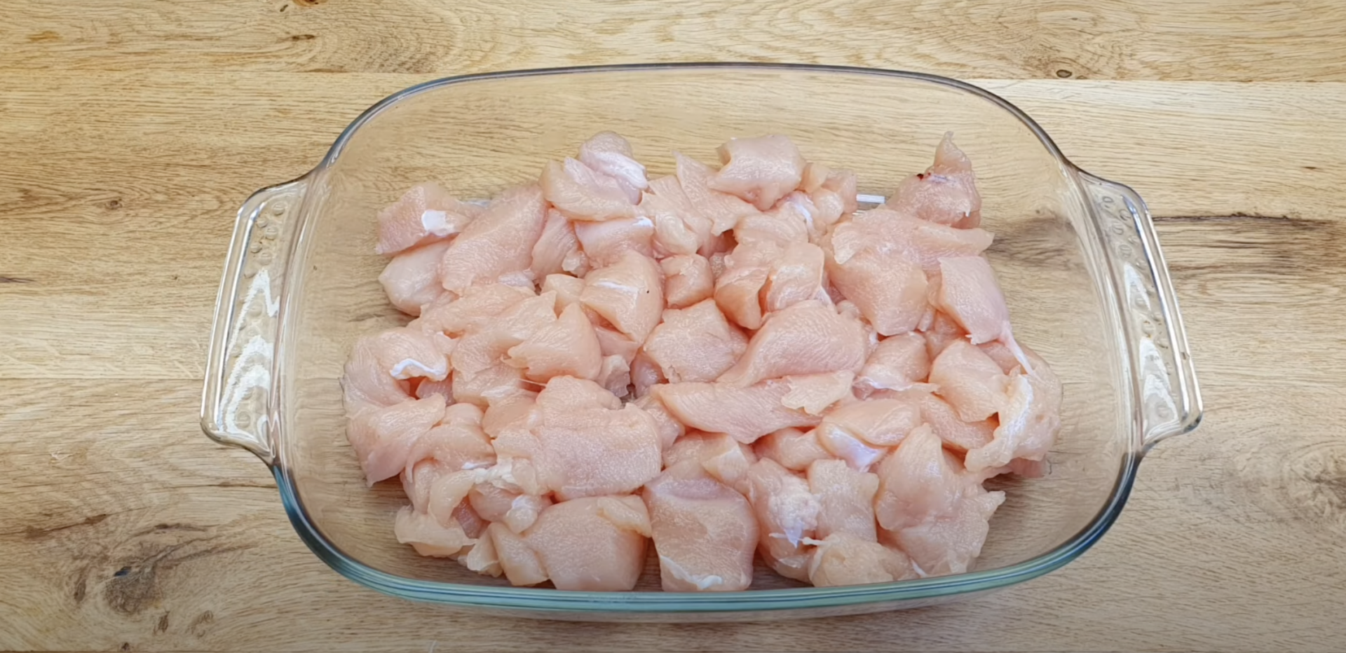 Pierś z kurczaka należy najpierw oczyścić i osuszyć. Następnie pokroić pierś kurczaka na kawałki i przyprawić potrawę solą.