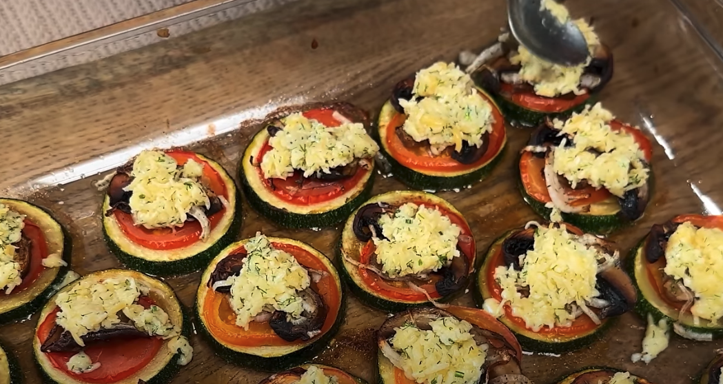 Pokrój cukinię na plastry. Posól, dodaj suszony czosnek, wędzoną paprykę i oliwę z oliwek. Dobrze wymieszaj i odstaw na 15 minut. Piecz w piekarniku nagrzanym do 180°C (390°F) przez 15 minut. Pokrój grzyby i cebulę, dopraw solą, pieprzem i ziołami prowansalskimi. Podsmaż na oliwie z oliwek do miękkości. Wymieszaj ser z majonezem i posiekanym koperkiem. Nałóż serową mieszankę na pieczoną cukinię. Wstaw do piekarnika na kolejne 5 minut.