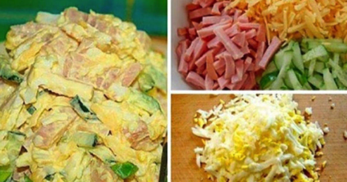 Szynkę i ogórki kroimy w cienkie paski. Żółty ser ścieramy na tarce. Jajka gotujemy na twardo i obieramy. Ścieramy na grubych oczkach tarki. Czosnek przeciskamy drobno przez praskę. Tak przygotowane składniki mieszamy w misce. Doprawiamy według uznania solą, pieprzem i majonezem.