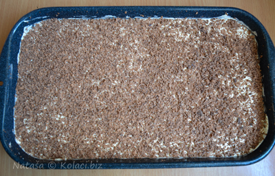 Pokryj je zrobioną uprzednio masą i wygładź ją przy pomocy łyżki. Wierzch posyp tartą czekoladą.