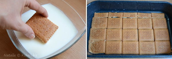 Herbatniki zanurzaj na chwilę w mleku i układaj na dnie formy.