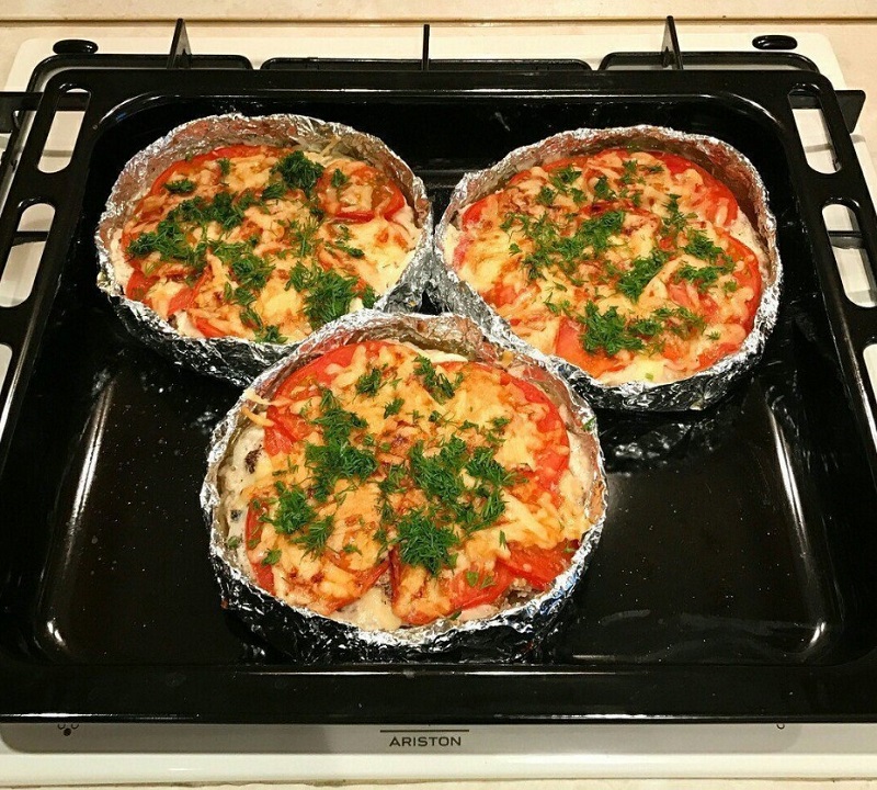 Tak przygotowaną mieszankę równomiernie rozsmaruj na ułożonym w foremkach kurczaku. Pokrój pomidory w cienkie paski i ułóż je na samym wierzchu dania. Zetrzyj ser, posiekaj czosnek, a następnie rozsyp na wypełnionych składnikami foremkach.