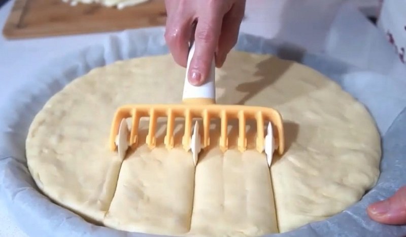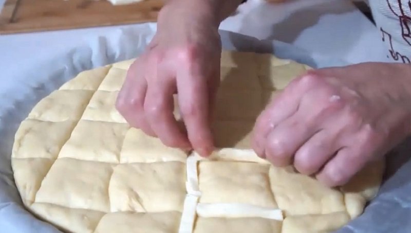 Okrągłą blachę wyłóż papierem do pieczenia i rozłóż na niej równomiernie ciasto. Używając noża, zrób na cieście nacięcia (tak jak na zdjęciu). Umieść w nich paski mozzarelli. Przykryj całość folią spożywczą i odstaw w ciepłe miejsce, aby ciasto jeszcze urosło.