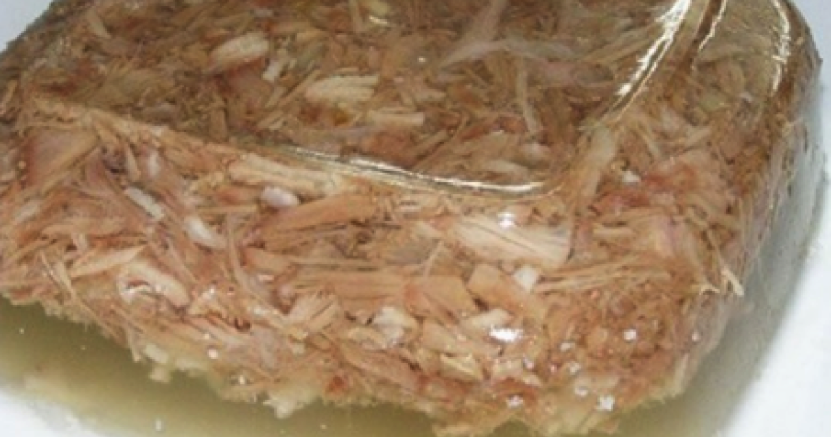 Do połowy szklanki z zimną wodą włóż żelatynę, aby odpowiednio napęczniała. Po godzinie wyjmij mięso z wywaru i ostudź. Pozostały bulion przecedź dokładnie i dodaj do niego żelatynę. Całość podgrzewaj delikatnie do dokładnego rozpuszczenia żelatyny.
