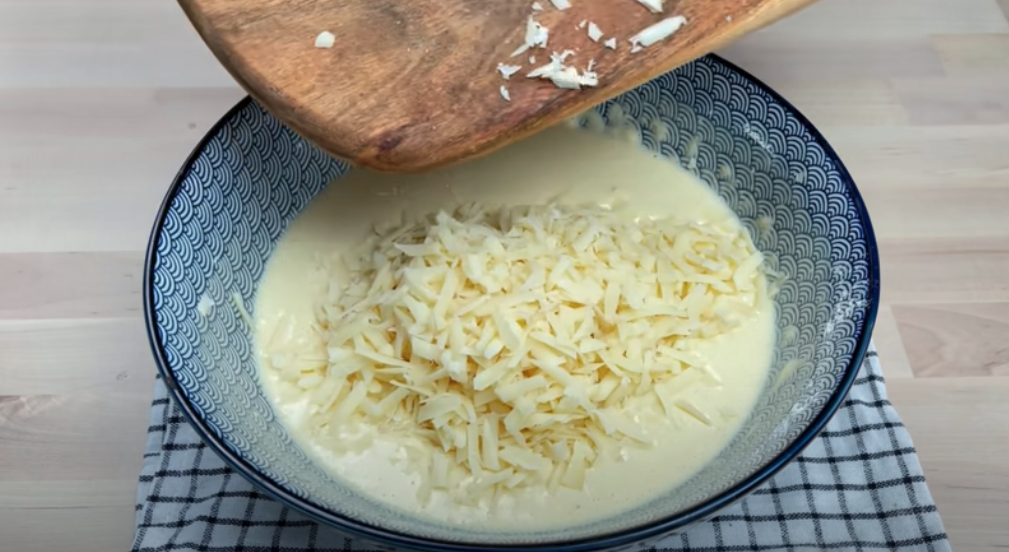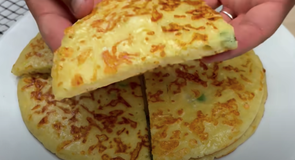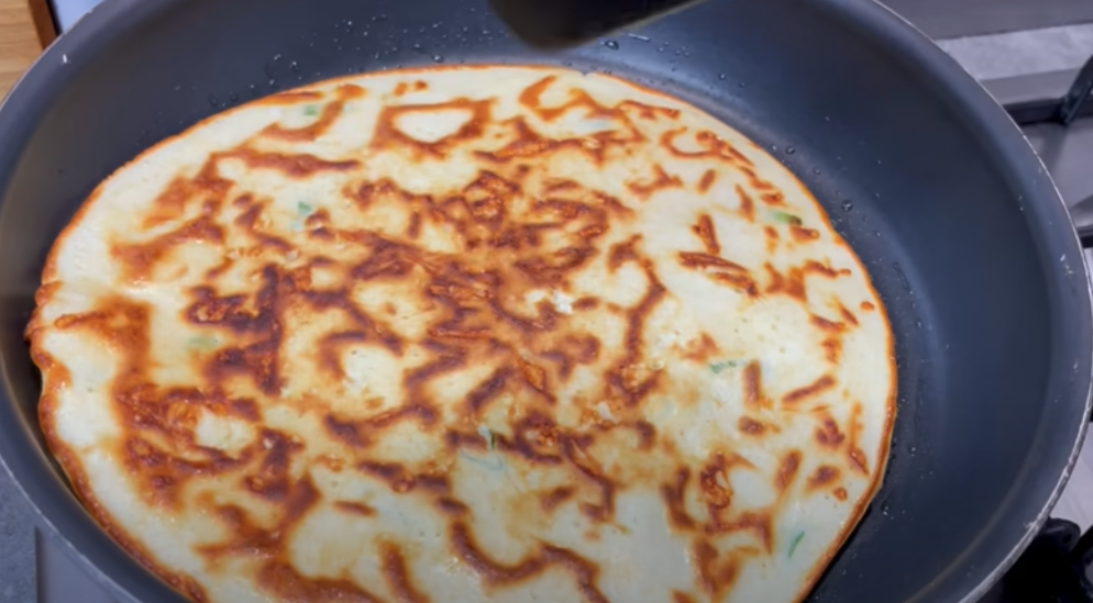 Zetrzyj 200 g wybranego sera. Dodaj starty ser do ciasta. Dodaj 2 łyżki posiekanej zielonej cebuli i wymieszaj. Przykryj ciasto i odstaw na 5 minut. Na rozgrzanej patelni dodaj odrobinę oleju. Wlej połowę ciasta na patelnię i rozprowadź równomiernie tylną stroną łyżki.