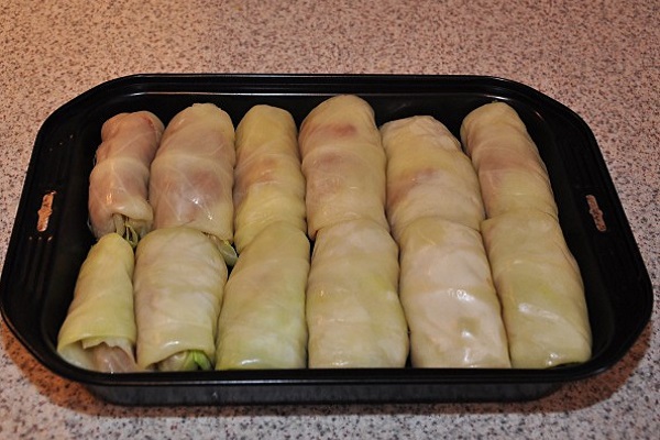 Formę wysmaruj olejem i ściśle układaj w niej gołąbki. Podlej wodą i przykryj folią aluminiową. Piecz w piekarniku rozgrzanym do 200 stopni przez 30 minut. Po tym czasie wyjmij gołąbki.