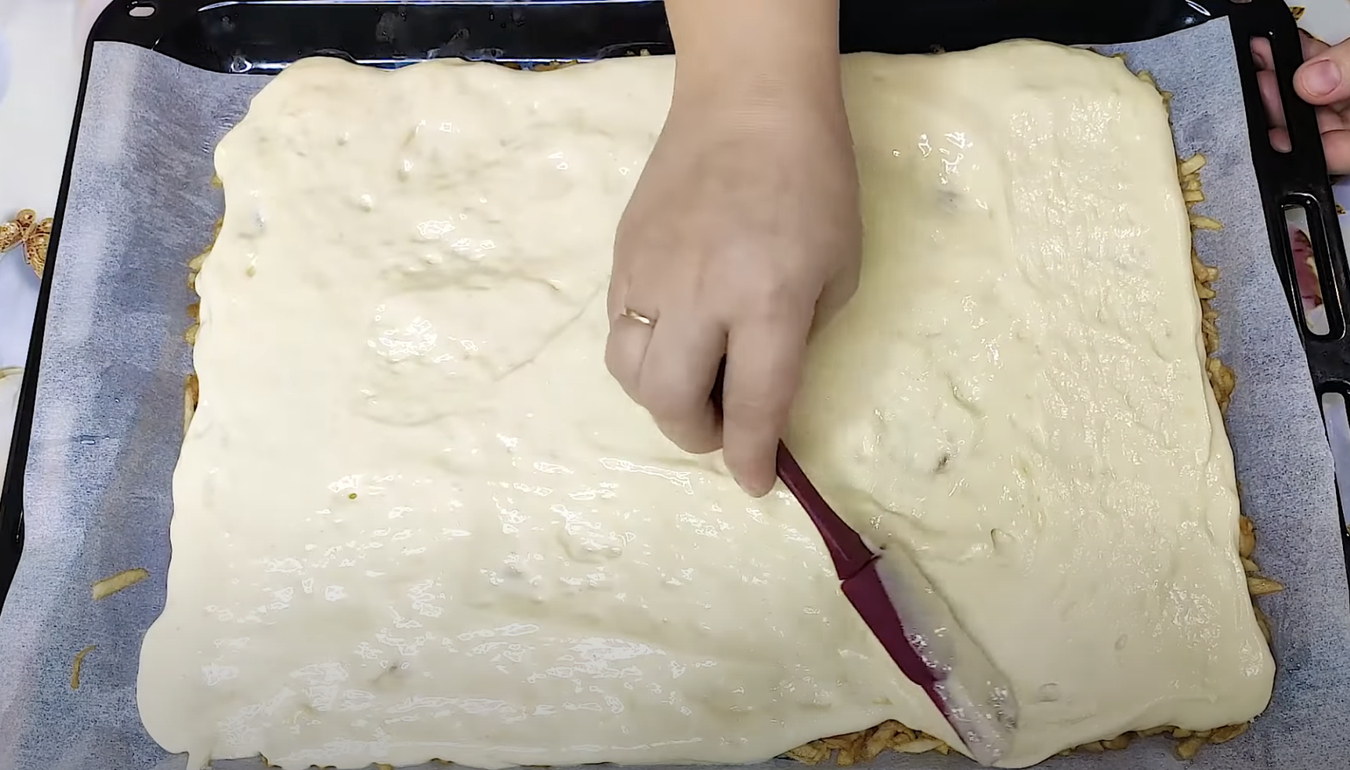 Rozłóż 4 starte jabłka na blasze do pieczenia. Polej je ciastem, a następnie zwiń w rulon. W ten sposób powstaje najpyszniejsze ciasto z jabłkami. Można je jeść codziennie.