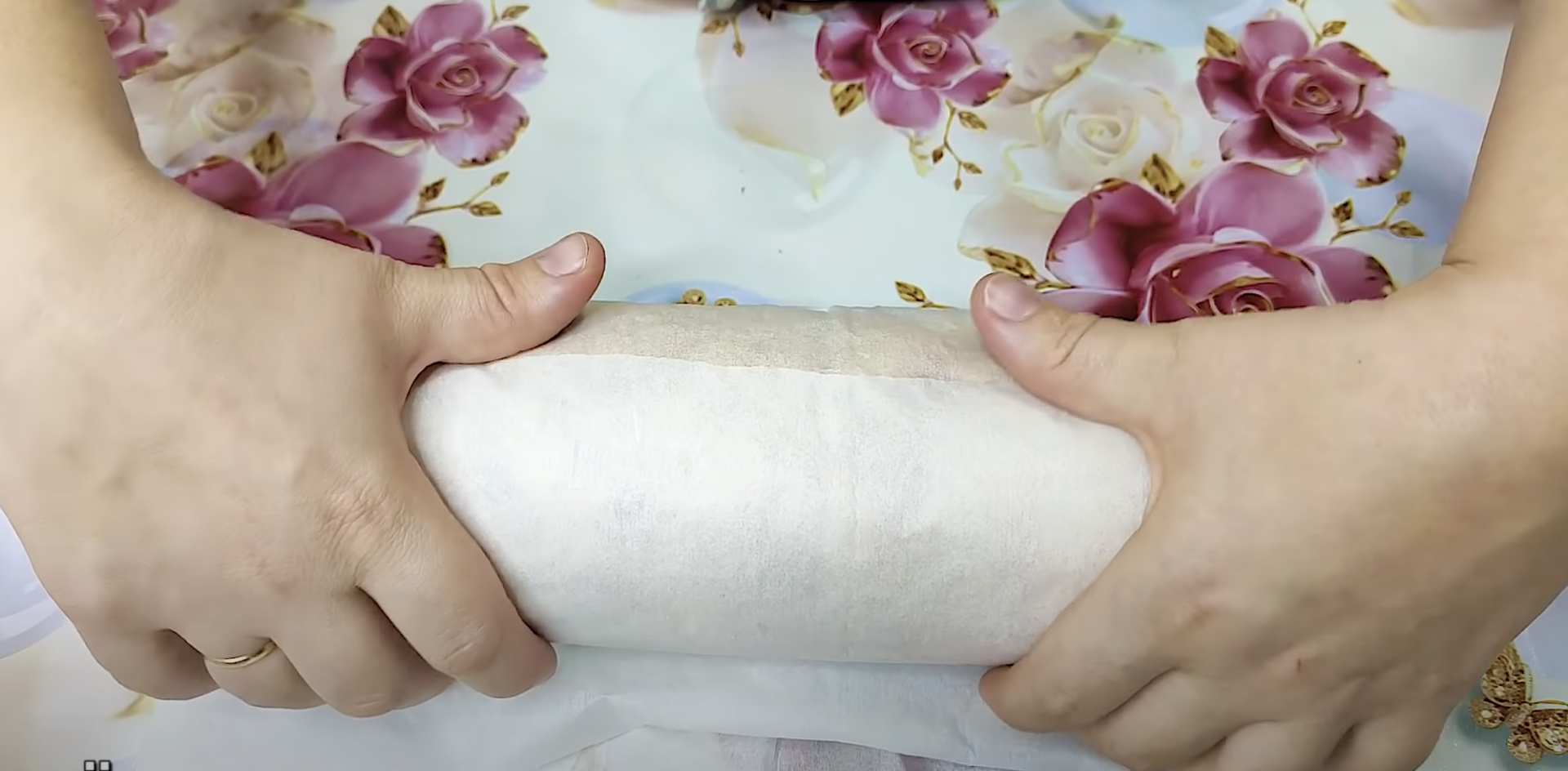 Odwróć ciasto do góry nogami i ostrożnie odklej papier do pieczenia, zaczynając od jabłka. Pozostaw roladę do ostygnięcia, zawijając ją w ręcznik. Posypać cukrem pudrem.