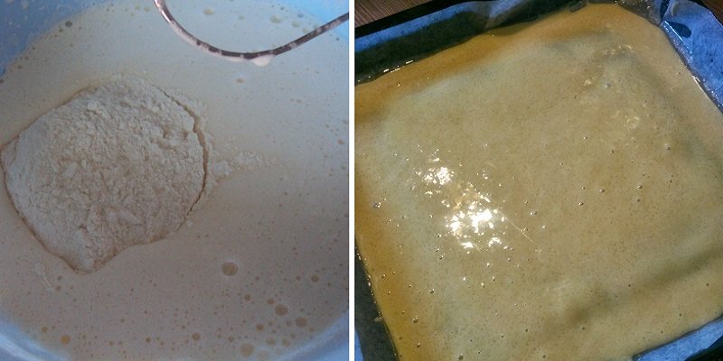 Obie mąki przesiać do przygotowanej masy i wymieszać mikserem na wolnych obrotach. Ciasto przelać do blaszki o wymiarach 20 x 30 cm wyłożonej papierem do pieczenia. Piec w nagrzanym wcześniej piekarniku przez 25 minut w 175 stopniach.