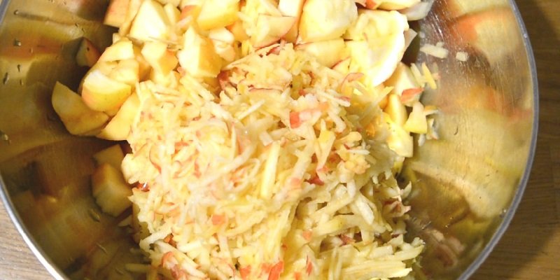 Jabłka umyć, obrać, usunąć gniazda i zetrzeć na tarce o grubych oczkach. Wrzucić je do rondelka z pozostałym masłem i gotować ok 2 -3 minuty od czasu do czasu mieszając, aby nie przypaliły się.