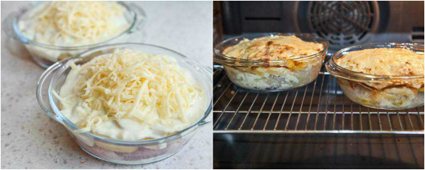 Polej ziemniaki obficie sosem z mąki i mleka, a później posyp tartym serem. Formę włóż do nagrzanego na 200 stopni piekarnika i piecz przez około 30-35 minut.