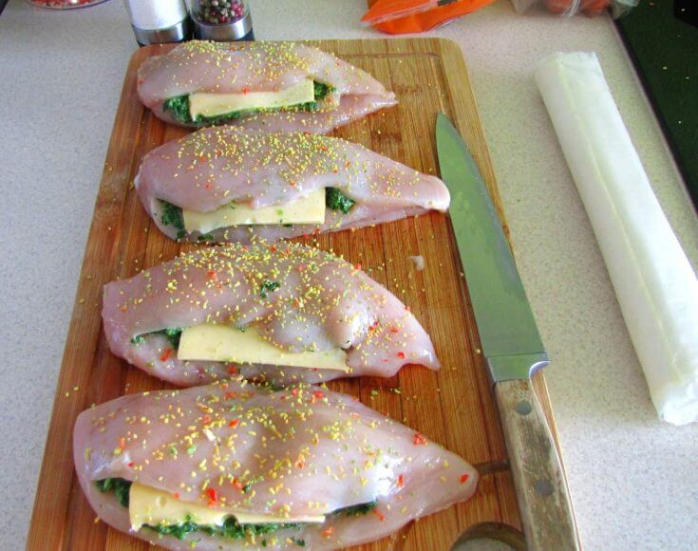 Teraz zajmij się mięsem. Każdą z polówek fileta nakrój nożem tak, by powstała kieszonka na farsz. Rozłóż farsz równomiernie do wszystkich powstałych w ten sposób kieszonek, na wierzchu każdej połóż plaster sera.