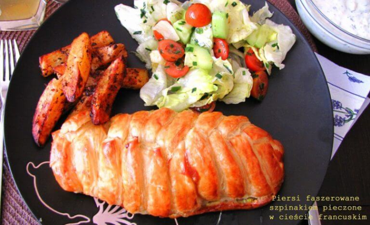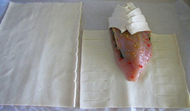 Oprósz mięso solą i pieprzem. Każdy z blatów ciasta francuskiego podziel na pół. Na środku każdego kawałka ciasta układaj kurczaka. Brzegi ciasta natnij w paski, tak, by można z nich było stworzyć fantazyjną plecionkę na wierzchu mięsa. Gotowe pakieciki posmaruj rozmąconym jajkiem.