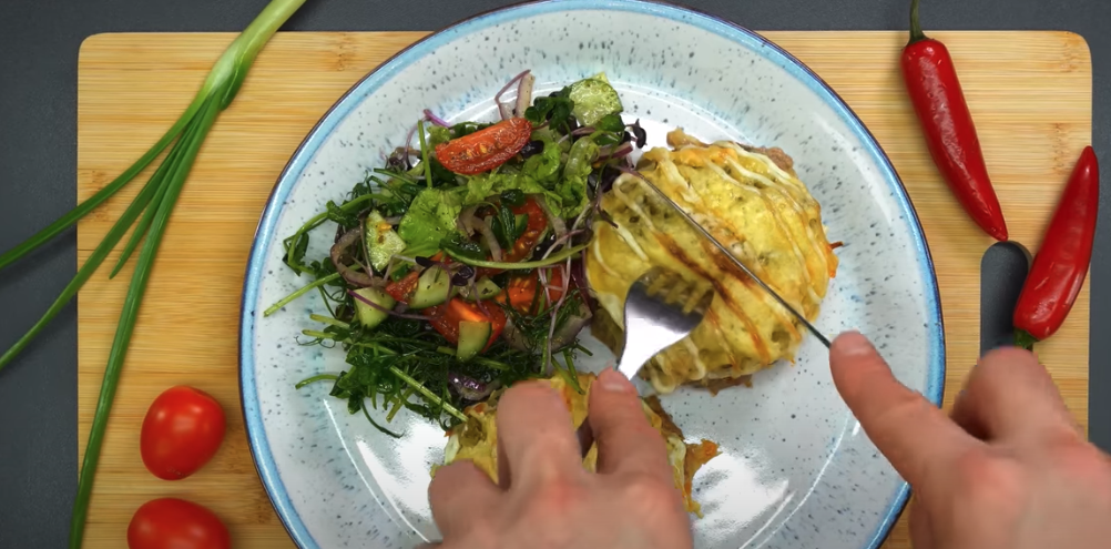 Starte ziemniaki przepłucz pod zimną wodą, aby usunąć nadmiar skrobi. Wymieszaj ziemniaki, ogórki i ser. Dodaj majonez i dobrze wymieszaj. Ułóż mieszankę ziemniaczaną wokół klopsików na blaszce. Piecz w nagrzanym piekarniku w temperaturze 180°C przez 45 minut. Wymieszaj mieszankę sałat, pokrojony ogórek, cebulę i pomidorki koktajlowe. Dodaj sól, pieprz i przyprawę do sałatek. Skrop oliwą z oliwek i dobrze wymieszaj.