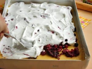 Pianę ubijemy do momentu aż będzie sztywna i lśniąca. Wykładamy na wierzch ciasta, które wkładamy do piekarnika nagrzanego do 180 stopni. Pieczemy przez czterdzieści minut.