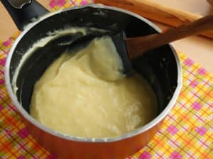 Cukier, mąkę, mąkę ziemniaczaną, cukier waniliowy i żółtko mieszamy w odrobinie mleka. Gotujemy budyń.