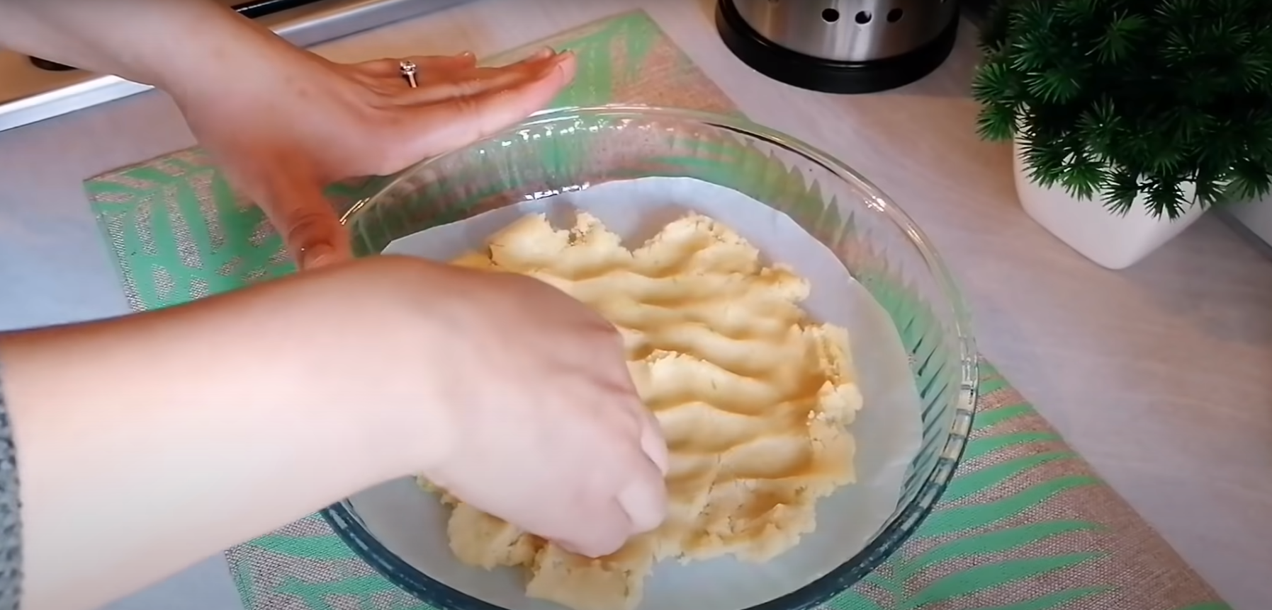 Na dnie formy ułóż pierwszą połowę ciasta. Krem jest teraz gotowy do przygotowania.