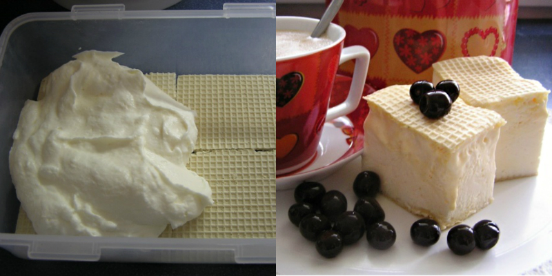 Dno dużego plastikowego pojemnika wyłóż waflami (można je podzielić na kawałki dla lepszego dopasowania). Rozsmaruj na nich masę i wygładź łyżką. Przykryj drugą warstwą wafli.
