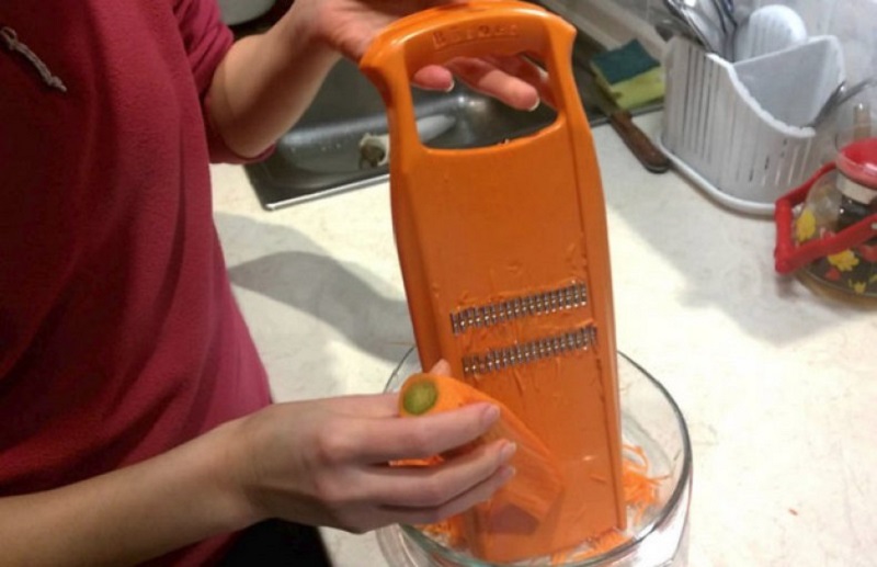 Umyj i obierz marchewkę, a następnie zetrzyj ją do dużej miski na tarce, aby uzyskać jak najdłuższe paski.