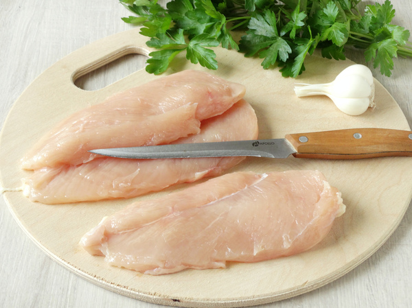 Następnie umyj i osusz piersi z kurczaka. Przygotowane mięso pokrój w cienkie plasterki i delikatnie rozbij. Zalej je wcześniej przygotowaną marynatą i odłóż na minimum dwie godziny w chłodne miejsce.