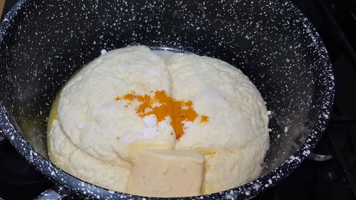 Potem pozbądź się całego nadmiaru płynu z sera. Aby to zrobić użyj durszlaka, przełóż do niego twaróg i porządnie wyciśnij. Następnie dodaj masło, sodę oraz przyprawy.