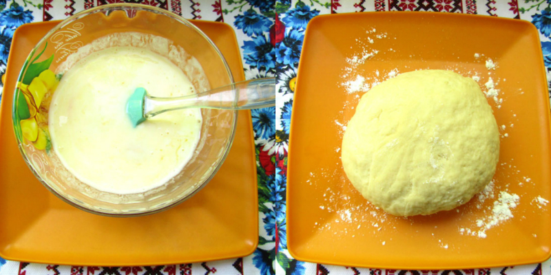 Następnie połącz suche produkty z tymi otrzymanymi wcześniej. Zagnieć dokładnie ciasto. Będzie ono gotowe w momencie kiedy przestanie lepić się do rąk. Gotowe ciasto rozwałkuj i pokrój na kawałki. Tak przygotowane kawałki, uformuj na płaskie kołopodobne spodki.