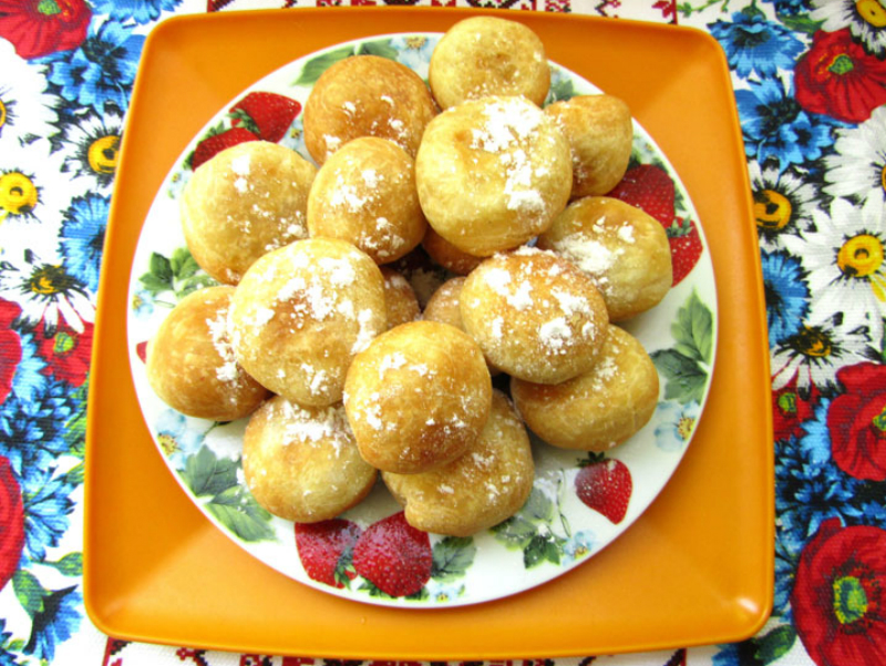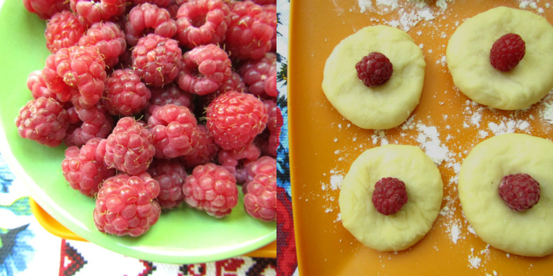 Na środku nich dodaj owoce. Ważne jest, że jeśli robisz pączki poza sezonem, możesz dać zamiast świeżych te mrożone. W momencie kiedy ułożysz owoce, połącz krawędzie i stwórz kule. Do smażenia przyda się olej lub inny tłuszcz.