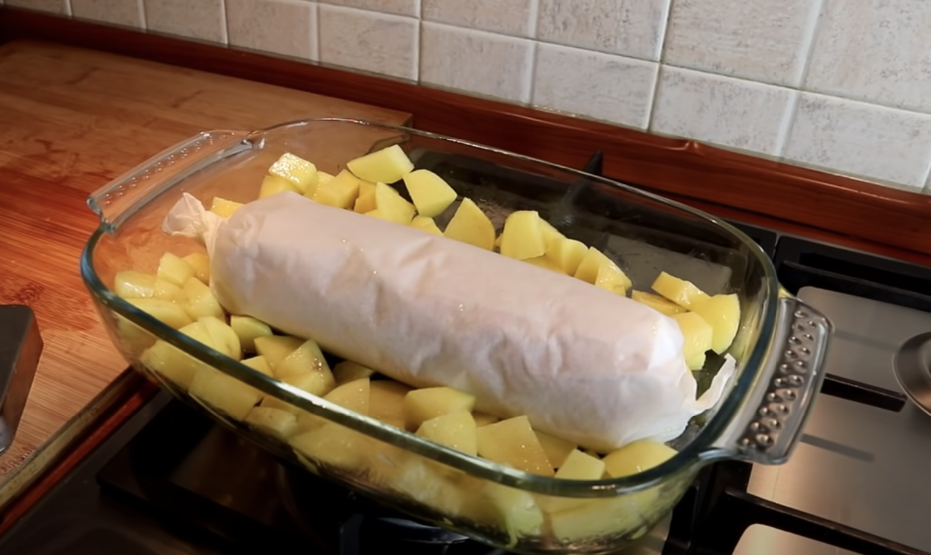 Zawiń roladę w drugą warstwę pergaminu do pieczenia. Posolić pokrojone w kostkę ziemniaki i ułożyć je w naczyniu żaroodpornym. Następnie ułożyć na nich roladę.
